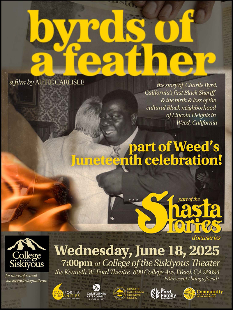 Additionally, there will be a screening of 'Byrd's of a Feather,'' the story of Charlie Byrd, California’s first Black Sheriff and the birth and loss of the cultural Black neighborhood of Lincoln Heights in Weed, CA. The showing is scheduled immediately after the Juneteenth Freedom Celebration on June 18 at 7:00 pm at the College of the Siskiyous Theater.