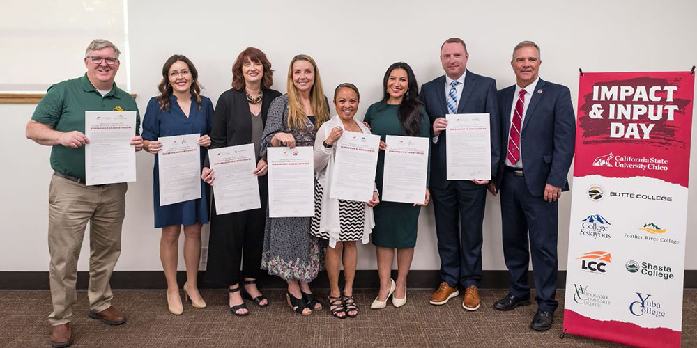 President Steve Perez and leadership from Butte College, College of the Siskiyous, Feather River College, Lassen Community College, Shasta College, Woodland Community College and Yuba College signed Memoranda of Understanding to formalize dual admission and streamlined transfer for students interested in pursuing their bachelor's degree at Chico State. This guaranteed admission and accompanying support mechanisms lay the groundwork to simplify and ease transfer students' pathways to pursue four-year degrees, credentials, and further education within their region.